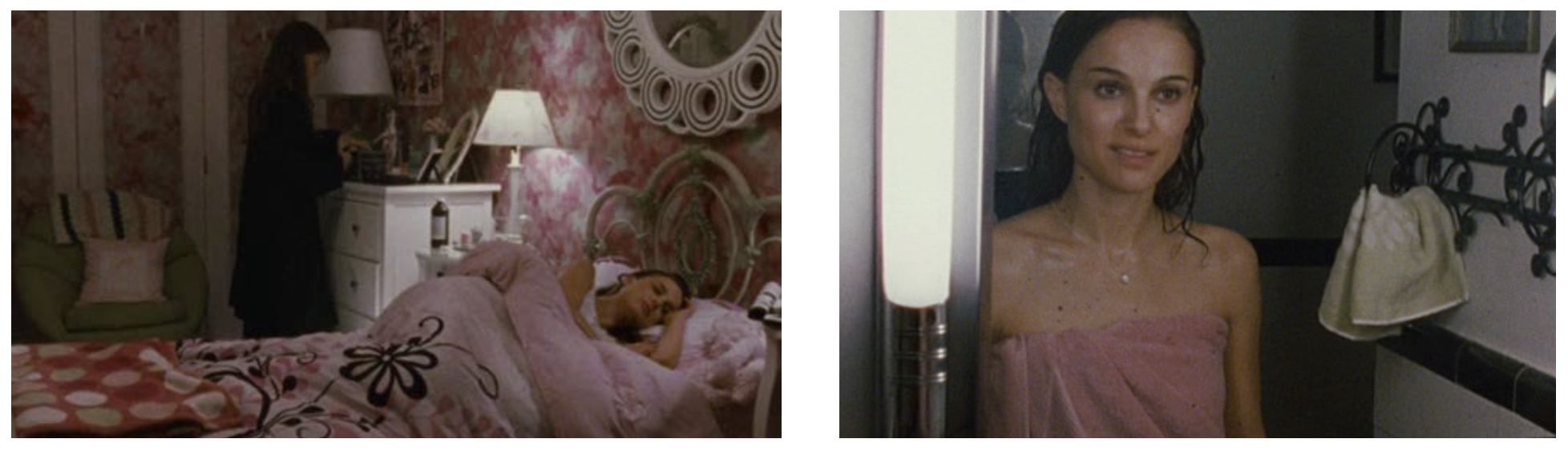 The color pink is directly related to Nina. While the apartment is entirely green, her room is flooded with pink. Also, the coat that she is always wearing is pink as well. This color is associated with her but in the context of the plot between her and her mother. "throught the movie, we see Nina been treated like a little girl by Erica, even though she is 24. So what better color to represent that than pink, the color of childhood. Besides, since around 1920, this has also become the color of femininity. That makes pink the perfect match for Nina. (Heller, 2004)